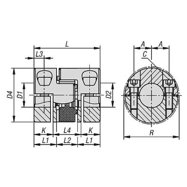ELASTOMER-KLAUENKUPPLUNG MIT RADIALER KLEMMNABE GR.38, D1=32, D2=32, L=86, AL...