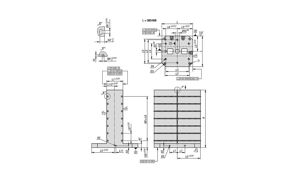AUFSPANNWINKEL DOPPELSEITIG, FORM:C, L=400, L1=150, H=500, BN=14, GJL300, MIT T-NUT