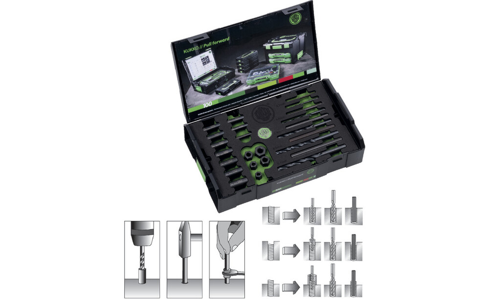 - komplett mit Schraubenausdrehern, HSS-Spiralbohrern und Bohrer-Führungsbüchsen für das problemlose Anbohren auch tief in Gewindelöchern abgebrochener Teile