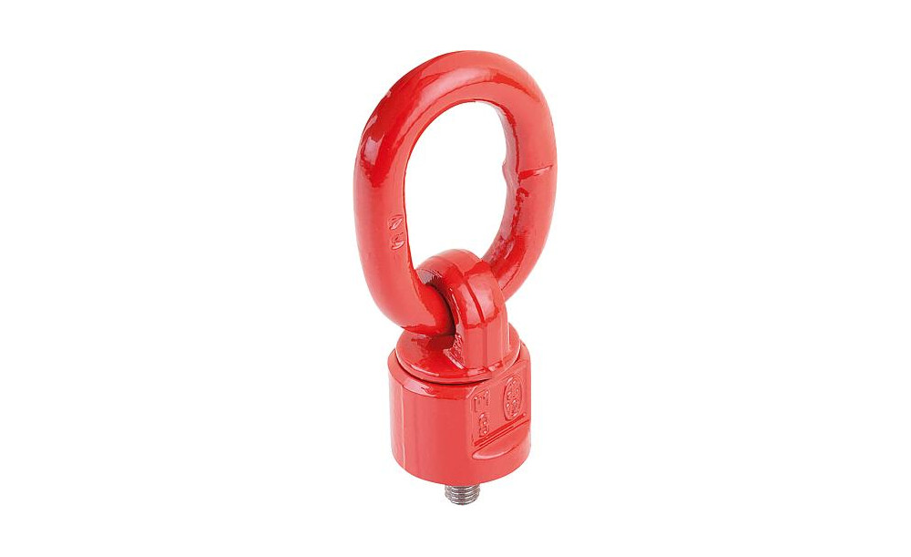 Kompakte und leichte Bauweise, allseitig voll belastbar. 4-fache Sicherheit gegen Bruch in allen Belastungsrichtungen. 360° drehbar. Schwenkbereich des Gliedes max. 180°. Durch die Kugellagerung ist der Anschlagwirbel auch unter Last drehbar.