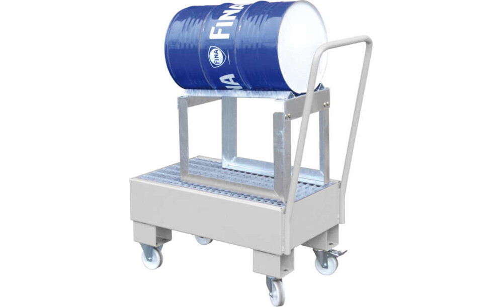 - Fahrgestell: Bauhöhe 125 mm, 1 Lenkrolle mit Feststeller. Ausführung: Zur liegenden Lagerung von 1 Fass à 60 Liter, mit verzinkter Fassauflage (zerlegte Anlieferung) Abb. zeigt lackierte Ausführung.