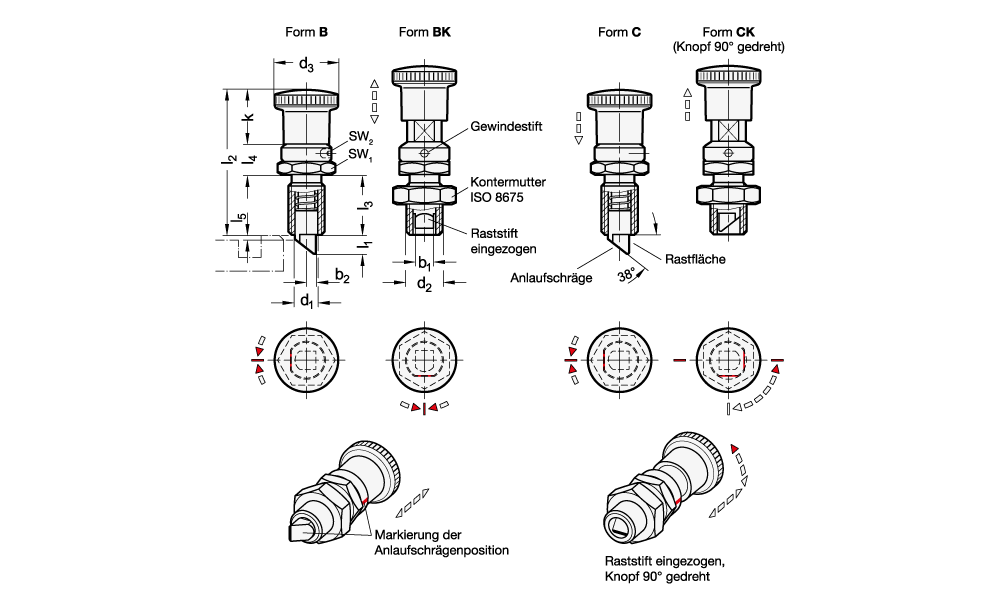Rastbolzen mit Rastsperre Form C / CK werden eingesetzt, wenn der Raststift zeitweise nicht einrasten soll. Hierzu wird der Knopf nach dem Einziehen des Stiftes um 90° gedreht. Durch eine Rastkerbe wird der Knopf in dieser Position gehalten.