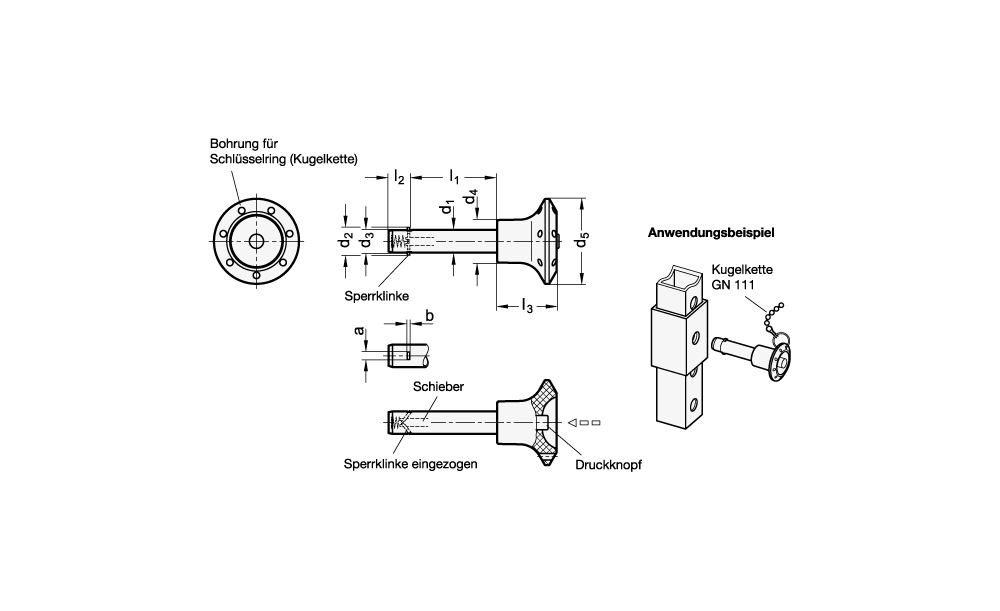 Die rechteckigen Sperrklinken aus Edelstahl-Blech halten den Steckbolzen axial in der Bohrung. Mit dem Druckknopf werden diese eingezogen und nach dem Loslassen stellt die Druckfeder sie wieder in die Sperrstellung zurück.