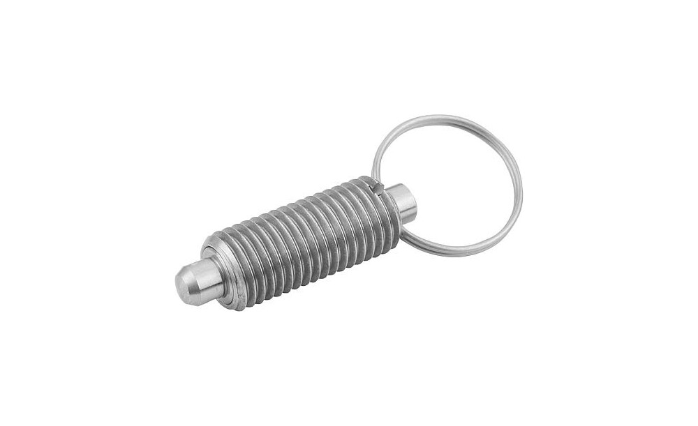 Werkstoff: Stahlausführung: Arretierstift gehärtet: Festigkeitsklasse 5.8. Edelstahlausführung: Arretierstift gehärtet: Gewindehülse 1.4305. Arretierstift 1.4034. Arretierstift nicht gehärtet: Gewindehülse 1.4305. Arretierstift 1.4305. Schlüsselring 1.4310, blank. Ausführung: Stahlausführung: Arretierstift gehärtet, geschliffen und brüniert. Edelstahlausführung: Arretierstift gehärtet, geschliffen und blank. Arretierstift nicht gehärtet, geschliffen und blank. Hinweis: Arretierbolzen werden dort eingesetzt, wo eine Veränderung der Arretierstellung durch Querkräfte verhindert werden soll. Erst nach Ausrückung des Bolzens kann in eine andere Arretierstellung gefahren werden. Der Schlüsselring ermöglicht eine Betätigungsweise des Arretierbolzens, z.B. automatisch (programmgesteuert) mit Hilfe eines Pneumatikzylinders oder erlaubt eine Fernbedienung über Bowdenzüge. Zum Einschrauben der Arretierbolzen kann eine Einschraubscheibe geliefert werden. Sie wird so auf die Gewindehülse aufgesetzt, dass die Mitnahmestifte in den Schlitz eingreifen. Auf Anfrage: Sonderausführungen.