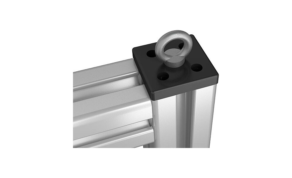 Zur Aufnahme von Stellfüßen, Rollen, Ringschrauben und anderen Elementen. Mit Nutensteinen kann die Fußplatte auch seitlich an die Profile angeschraubt werden.