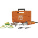 3 Schleifarme (je 1× 3/6 mm gekröpft, 6 mm gerade, 20 mm gerade), 10 Schleifbänder 3 mm (Korn 120), 10 Schleifbänder 6 mm (Korn 120), 10 Schleifbänder 20 mm (Korn 120), 5 Vliesbänder 6 mm (mittel), Handwerkerkoffer.