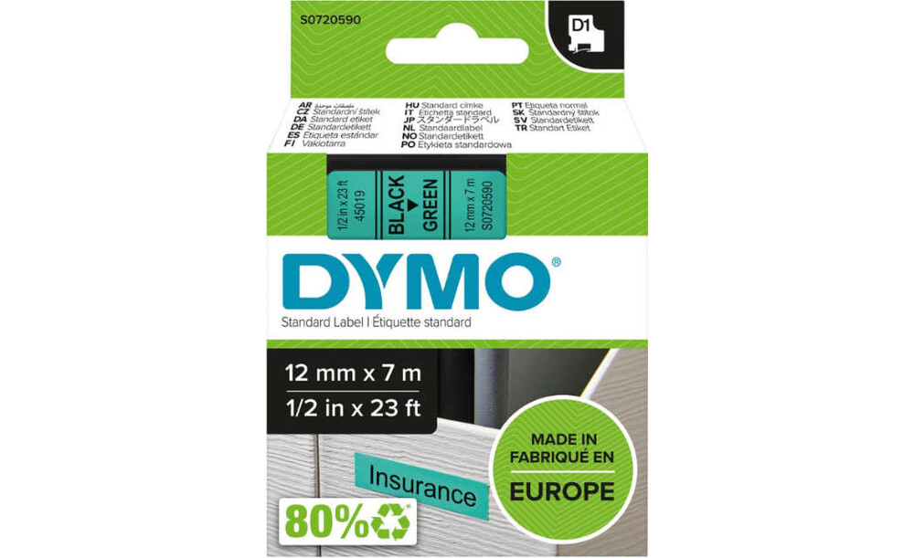 Schriftband DYMO, D1 45019 schwarz/grün 12mmx7m DYMO