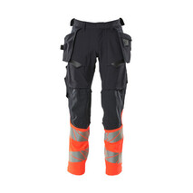 Fluoreszierende Kontrastfarbe und mit Reflexen. Hat ein wasserabweisendes Finish. Zweifarbig. Vier-Wege-Stretchstoff mit geringem Gewicht und guter Strapazierfähigkeit. Zweifache Kappnähte an den Beinen und im Schritt. Niedrige Taille. Verdeckter Knopfverschluss.Hosenbeine sind ergonomisch geformt. Abnehmbare Hängetaschen. Innere Hängetasche mit Druckknopfverschluss. Hängetasche mit gefütterter Handytasche und Magnetverschluss. Hängetaschen mit Kevlar® und CORDURA®-Gewebe Verstärkungen. Gürtelschlaufen. Werkzeugschlaufenan beiden Seiten des Bundes. Hosenschlitz mit Reißverschluss. Vordertaschen. Gesäßtaschen, verstärkt und mit Patte. Beidseitig verdeckte Hammerschlaufen. Knopf (abnehmbar) zum Befestigen eines Messerhalters. Zollstocktasche mit Kevlar®-Verstärkungen. Taschen mitPatte vorne am Oberschenkel. Knietaschen aus CORDURA® Zwei-Wege-Stretchstoff mit Belüftung. Einfache, individuelle Regulierung der Knietaschenhöhe. Schenkeltasche mit gefütterter Handytasche, Magnetverschluss und integriertem ID-Kartenhalter. ID-Kartenhalter ist abnehmbar. Senkrechter Reißverschluss für Belüftung am Oberschenkel hinten. Mit Druckeffekten. Die Schrittlänge kann um 3 cm verlängert werden, indem die rote Naht innen am Beinabschluss entfernt wird. Wir empfehlen den MASCOT® Waterloo, MASCOT® Grant, MASCOT® Likasi und 20118-915 Knieschutz zu diesem Modell. Hi-Vis Gruppe Z. Zertifiziert nach EN ISO 20471 - Kl. 1. Das Produkt ist zertifiziert, dass dieses mit einem Logo von 0,0400 m² versehen werden darf. Dieses zulässige Areal darf nicht überschritten werden. Das Logo auf der Vorder- und Rückseite darf jeweils maximal 50% des gesamten Logoareals betragen, um die Zertifizierung gemäß EN ISO 20471 beizubehalten.