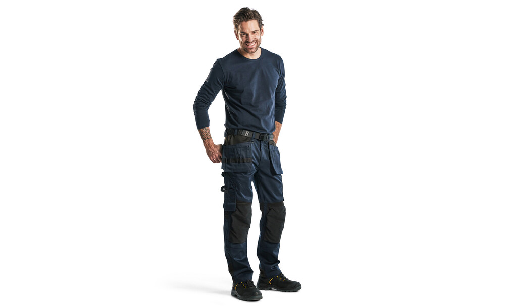 Funktionelle und komfortable Handwerker Arbeitshose mit Nageltaschen und leicht zugänglichen Taschen, einschließlich einer Handytasche aus Stretchmaterial, die für die meisten Handys geeignet ist. Kniepolstertaschen aus CORDURA® Stretch Stoff für optimale Passform und Haltbarkeit. Zwei Gesäßtaschen mit Balg und Schlaufe für Hammerhalter, sowie eine verstärkte Zollstocktasche, Stifttasche und Messerhalter. Vorgeformte Beine sorgen für einen guten Sitz.