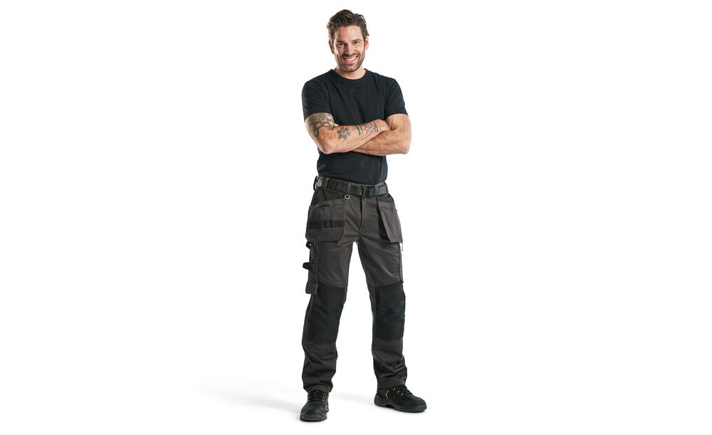 Funktionelle und komfortable Handwerker Arbeitshose mit Nageltaschen und leicht zugänglichen Taschen, einschließlich einer Handytasche aus Stretchmaterial, die für die meisten Handys geeignet ist. Kniepolstertaschen aus CORDURA® Stretch Stoff für optimale Passform und Haltbarkeit. Zwei Gesäßtaschen mit Balg und Schlaufe für Hammerhalter, sowie eine verstärkte Zollstocktasche, Stifttasche und Messerhalter. Vorgeformte Beine sorgen für einen guten Sitz.
