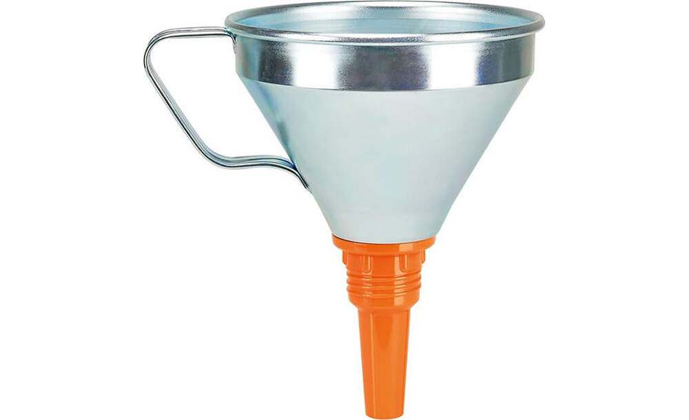 -Weißblechtrichter Dieser Weißblechtrichter hat einen Polyethylen-Auslauf mit auswechselbarem Messingfeinsieb.