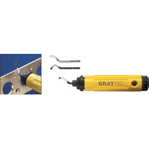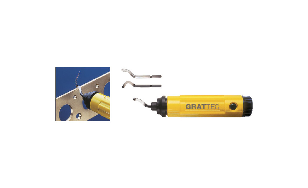 - je eine Klinge GT-E100 (HSS) für Stahl, Aluminium und Kunststoff, GT-E200 (HSS) für Messing und Guss und GT-E300 (HSS) für Innen- und Außengrat an Bohrungen in Blechen und Rohren