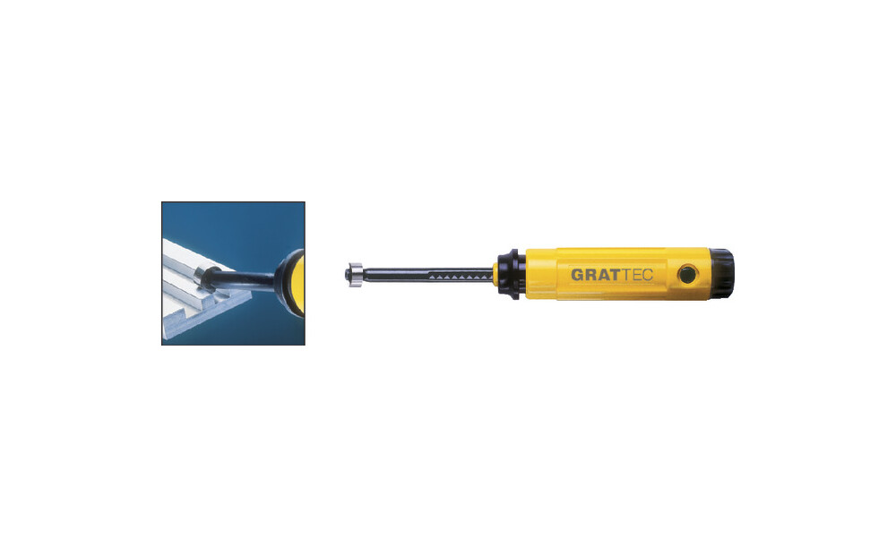 - Ausführungzum Entgraten von schmalen und breiten Nuten entsprechend der Klingengröße, für Keilnuten, Wellen und Bohrungen, Universal-Kunststoffgriff EL-1000GT, Klingenhalter mit Längenverstellbarkeit EL 0400GT, eine Klinge GT-N80K