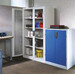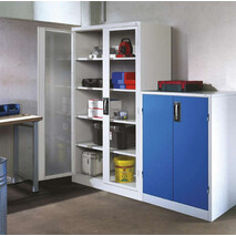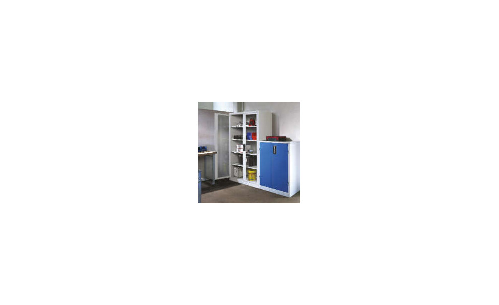 -Beistellschrank mit Sichtfenster (RAL 7035/5012), mit 4 verstellbaren Einlegeböden Diese Beistellschränke bestehen aus einer langlebigen Stahlblechkonstruktion.