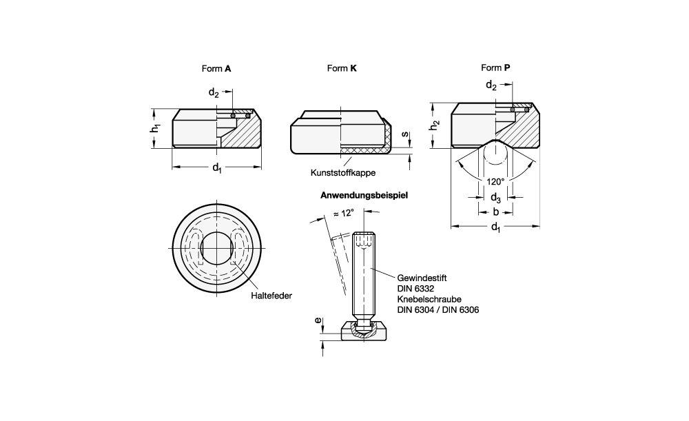 Druckstücke GN 6311.1 werden in Verbindung mit Schrauben mit Druckzapfen (Gewindestifte DIN 6332, Knebelschrauben DIN 6304, DIN 6306) verwendet. Sie passen sich an unebene bzw. zylindrische Flächen an und verhindern eine Übertragung der Drehbewegung der Schraube auf das Werkstück.