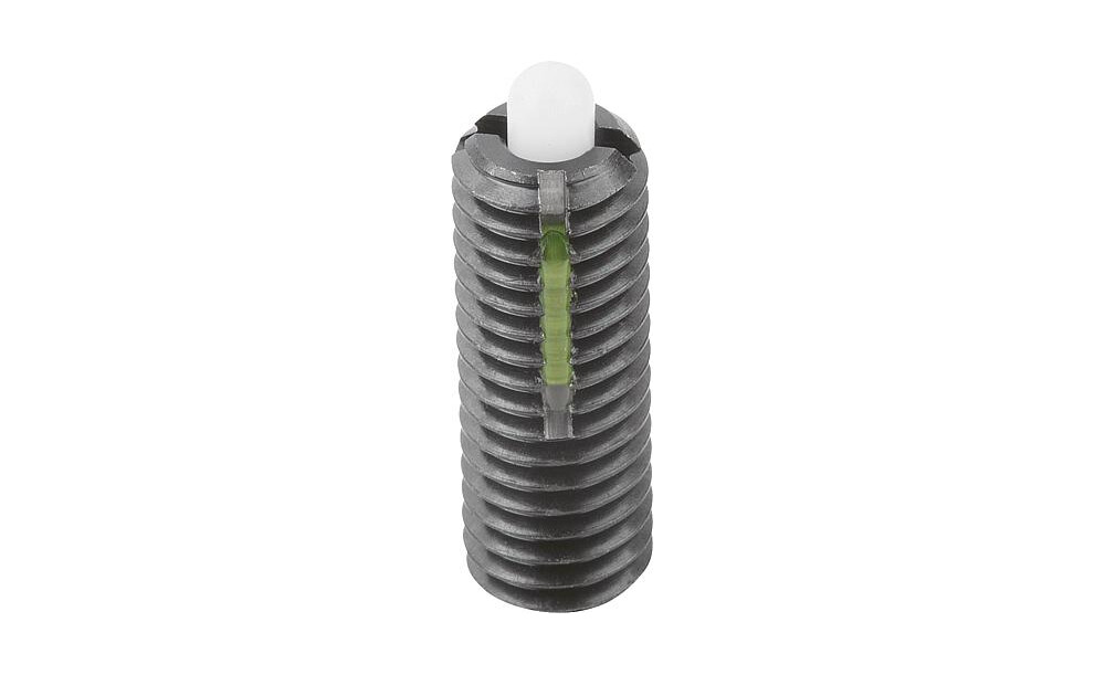FEDERNDES DRUCKSTÜCK LEICHTE FEDERKRAFT, MIT GEWINDESICHERUNG D=M12 L=28, STAHL, KOMP:BOLZEN AUS POM