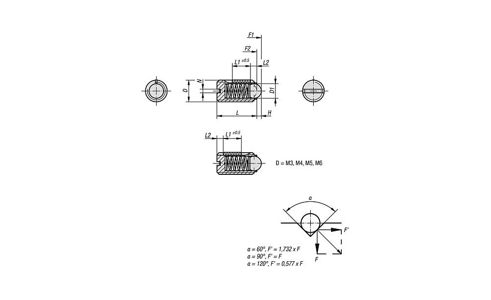 FEDERNDES DRUCKSTÜCK STANDARD FEDERKRAFT, MIT GEWINDESICHERUNG D=M04 L=9, STAHL, KOMP:KUGEL AUS STAHL