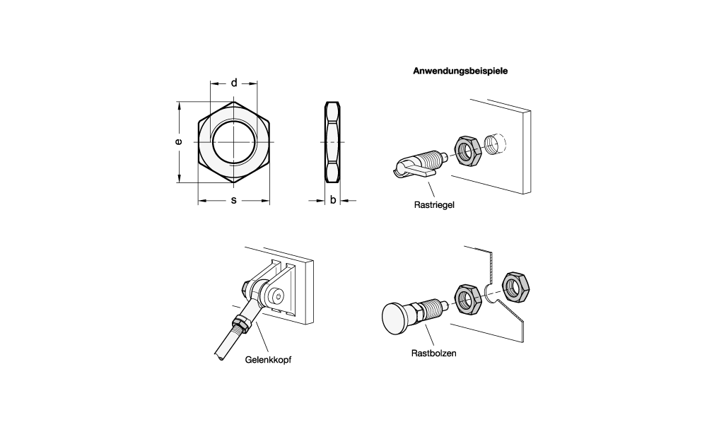 Darüber hinaus werden die Muttern in Kombination mit Rastbolzen, Rastriegeln, Positionierbuchsen oder Gelenkköpfen verwendet.