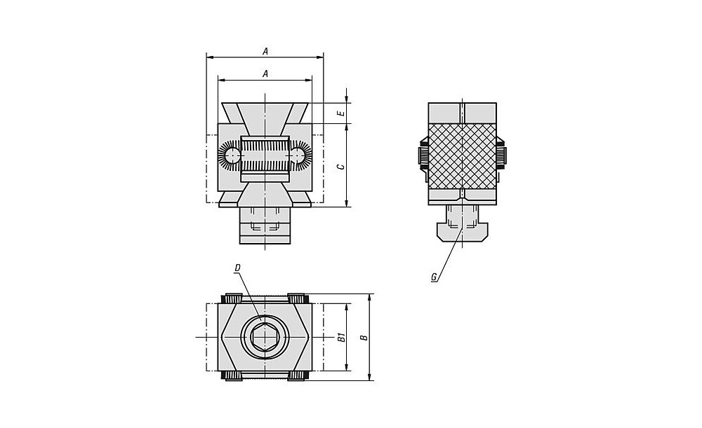 Wahlweise können die entsprechenden Keilspanner in einer Rasterbohrung oder T-Nut befestigt werden. Durch Eindrehen der Zylinderschraube DIN 912 bewegen sich die beiden Spannsegmente nach außen und drücken die Werkstücke gegen einen festen Anschlag.
