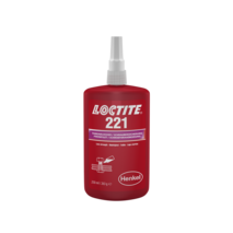 LOCTITE 221 ist eine Schraubensicherung auf Methacrylatbasis für niedrigfeste Verbindungen mit kleinen Gewinden bis max. M12. Typische Zeiten zur Erreichung der Handfestigkeit sind 25 Minuten auf Stahl, 20 Minuten auf Messing und 210 Minuten auf Edelstahl. Das niedrigviskose Produkt mit einem Losbrechmoment von 8,5 Nm wird für Gewindeverbindungen eingesetzt, die mit normalem Handwerkzeug leicht demontierbar sein müssen.