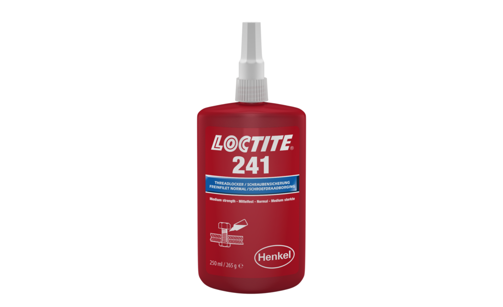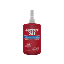 LOCTITE 241 ist eine Schraubensicherung auf Methacrylatbasis für mittelfeste Verbindungen mit kleinen Gewinden. Typische Zeiten zur Erreichung der Handfestigkeit sind 35 Minuten auf Stahl, 12 Minuten auf Messing und 240 Minuten auf Edelstahl. Das niedrigviskose Produkt mit einem Losbrechmoment von 11,5 Nm wird für Gewindeverbindungen eingesetzt, die mit normalem Handwerkzeug demontierbar sein müssen.