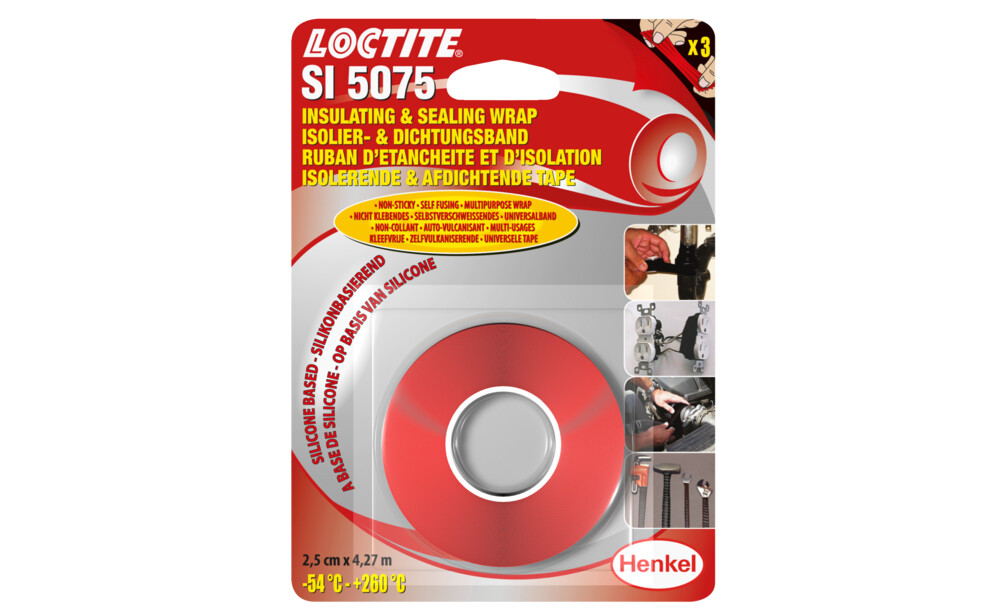 LOCTITE SI 5075 ist ein nicht klebendes, selbstverschweißendes Universalband für Dichtungsreparaturen. Es bietet eine Zugscherfestigkeit von 50 kg/cm², lässt sich auf das 3-fache seiner ursprünglichen Länge dehnen und erzielt sofortige Dichtwirkung. Es ist beständig gegen UV-Licht, Salzwasser, Kraftstoffe und Säuren. LOCTITE SI 5075 hat außerdem eine dielektrische Durchschlagfestigkeit bis 15k V/mm und einen Einsatztemperaturbereich von -54 bis +260 °C.
