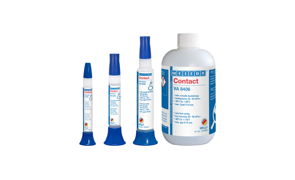 WEICON Contact VA 8406 eignet sich für schnelle Fixierungen und die Verklebung von verschiedenen Gummimaterialien, wie Vollgummi oder Moosgummi, Kunststoffen und von EPDM-Elastomeren. In Verbindung mit WEICON CA-Primer eignet sich VA 8406 auch für Polyolefine (PE-Polyethylen, PP-Polypropylen) sowie für PTFE und Silicone.