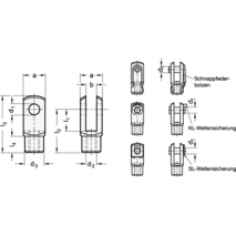 Gabelgelenke GN 751 bestehen aus dem Gabelkopf nach DIN 71752 und einem Bolzen mit axialer Wellensicherung (Form KL und SL) oder einem Schnappfederbolzen (Form B).