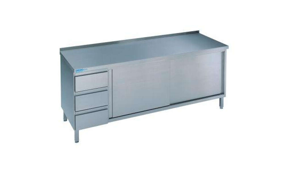 -Edelstahl-Arbeitstisch, mit Schubladenblock und Schiebetür Diese Arbeitstische sind rostfrei, robust und pflegeleicht.