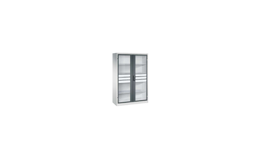 -Schwerlastschrank, mit Flügeltüren und Schubladenblock mittig, RAL 7035/7016 Diese Schwerlastschränke bestehen aus einer langlebigen und stabilen Stahlblechkonstruktion.