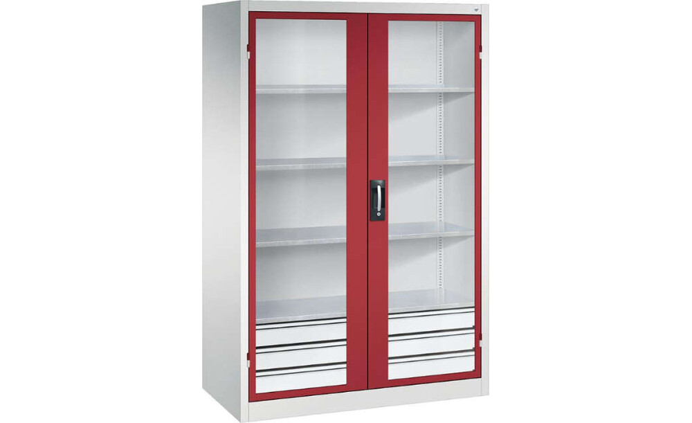 -Schwerlastschrank, mit Flügeltüren und Schubladenblock unten, RAL 7035/3003 Diese Schwerlastschränke bestehen aus einer langlebigen und stabilen Stahlblechkonstruktion.