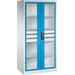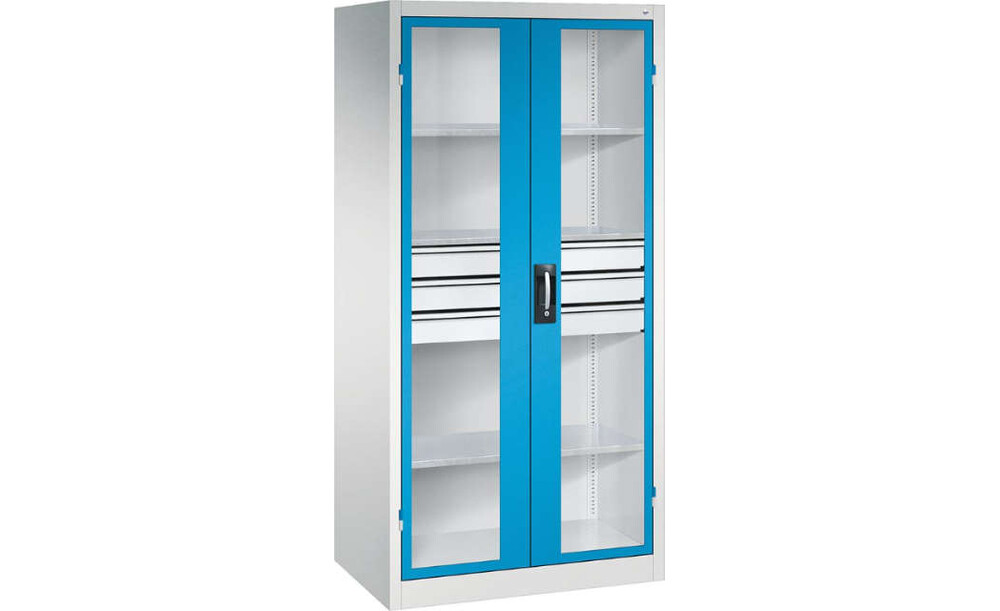 -Schwerlastschrank, mit Flügeltüren und Schubladenblock mittig, RAL 7035/5012 Diese Schwerlastschränke bestehen aus einer langlebigen und stabilen Stahlblechkonstruktion.