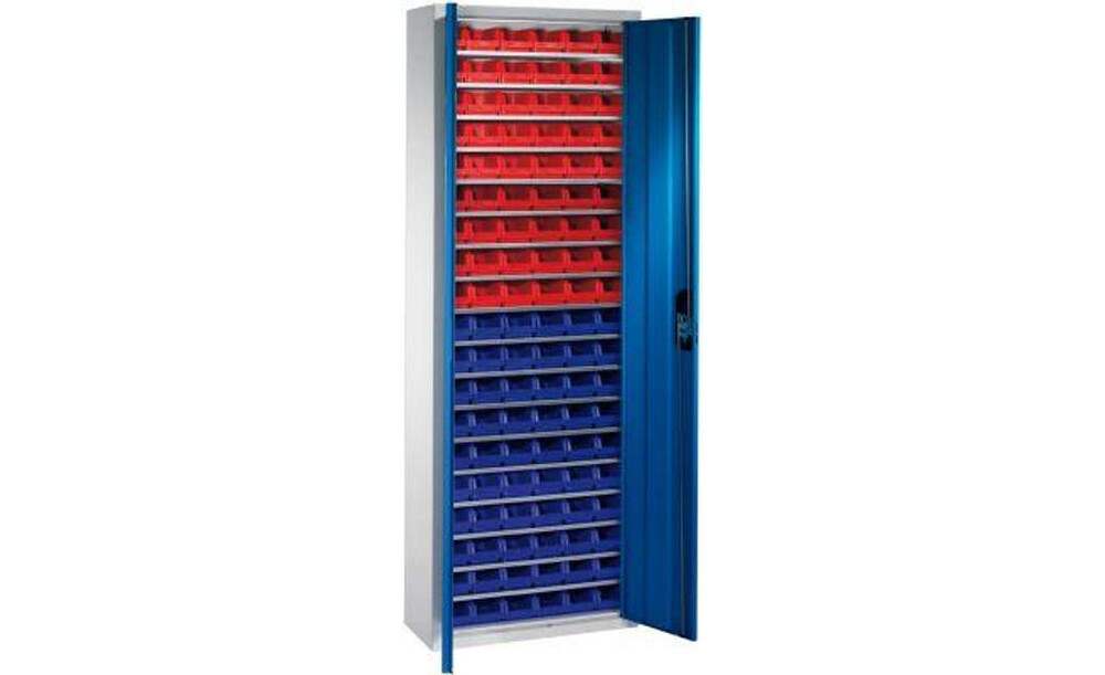 Lager-Regalschrank C+P, B700xT300xH1980 mm RAL 7035/5012 mit Türen 18 Fachböden, 114 Kästen