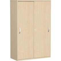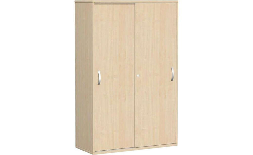 -Schiebetürenschrank zu Büromöbelserie „Pro“, mit Mitteltrennwand Diese Büromöbelserie lässt sich beliebig kombinieren und bietet variable Stauraumlösungen. Dieser Schiebetürenschrank mit Mitteltrennwand hat 4 Ordnerhöhen.