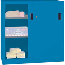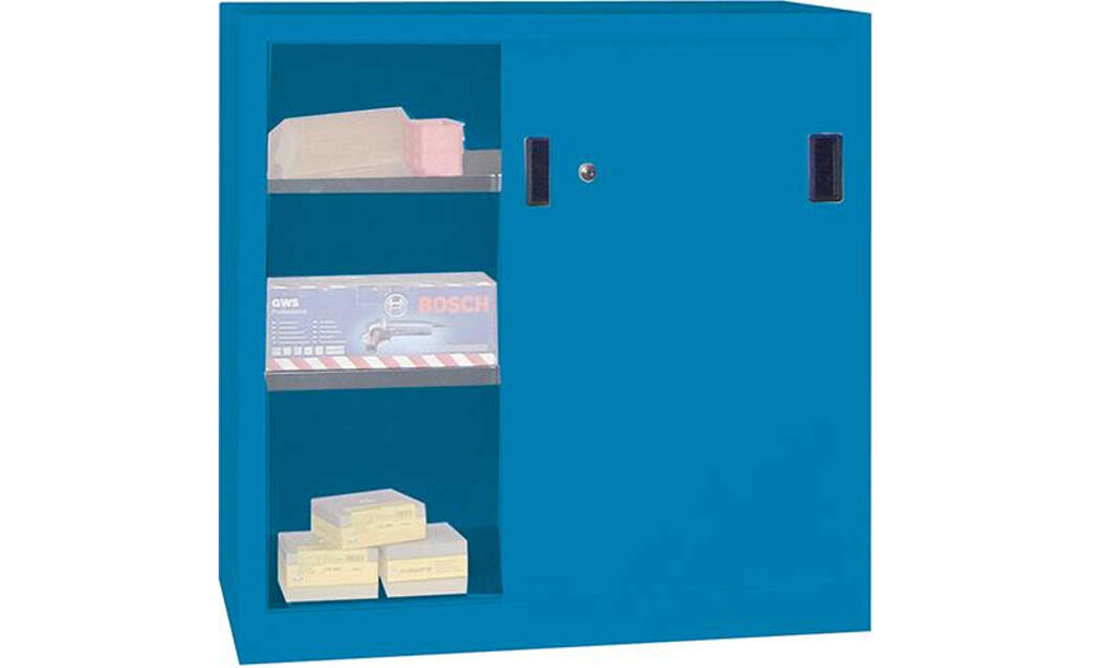 -Schiebetürenschrank mit Vollblechtüren, Böden gepulvert Dieser Schiebetürenschrank verfügt über eine solide verschweißte Stahlblechkonstruktion mit hochwertiger Pulverbeschichtung.