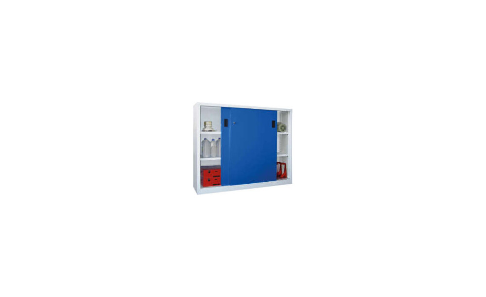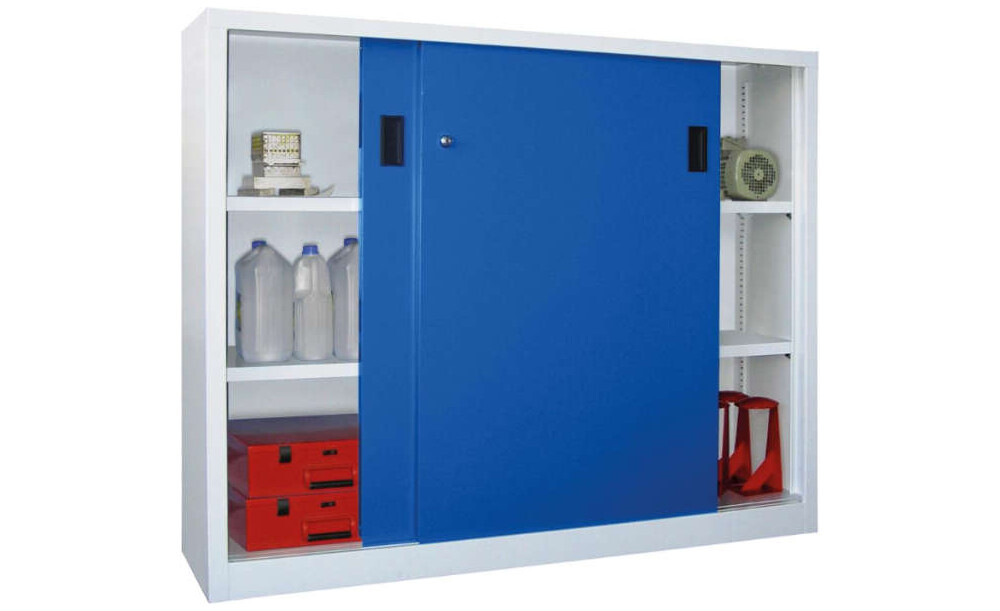 -Schwerlastschiebetürenschrank mit Vollblechtüren und Mitteltrennwand, Böden verzinkt Dieser Schwerlastschiebetürenschrank verfügt über eine solide verschweißte Stahlblechkonstruktion mit hochwertiger Pulverbeschichtung.