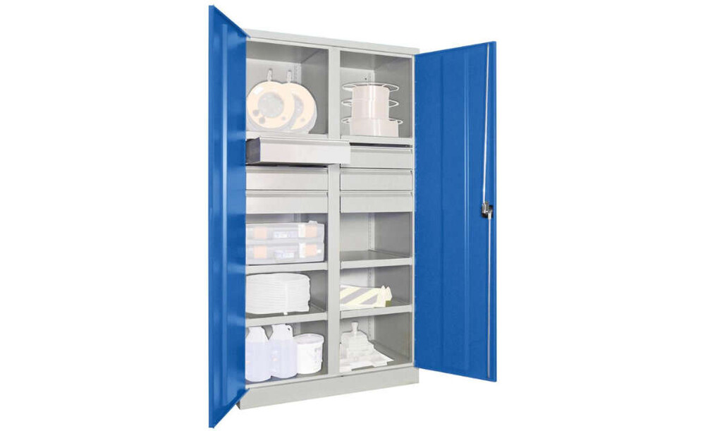 Schwerlastschrank PAVOY, 1950/630/1040 Drehg., mit Trennwand 6 Böden, 6 Schubladen