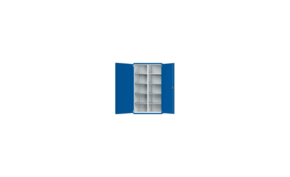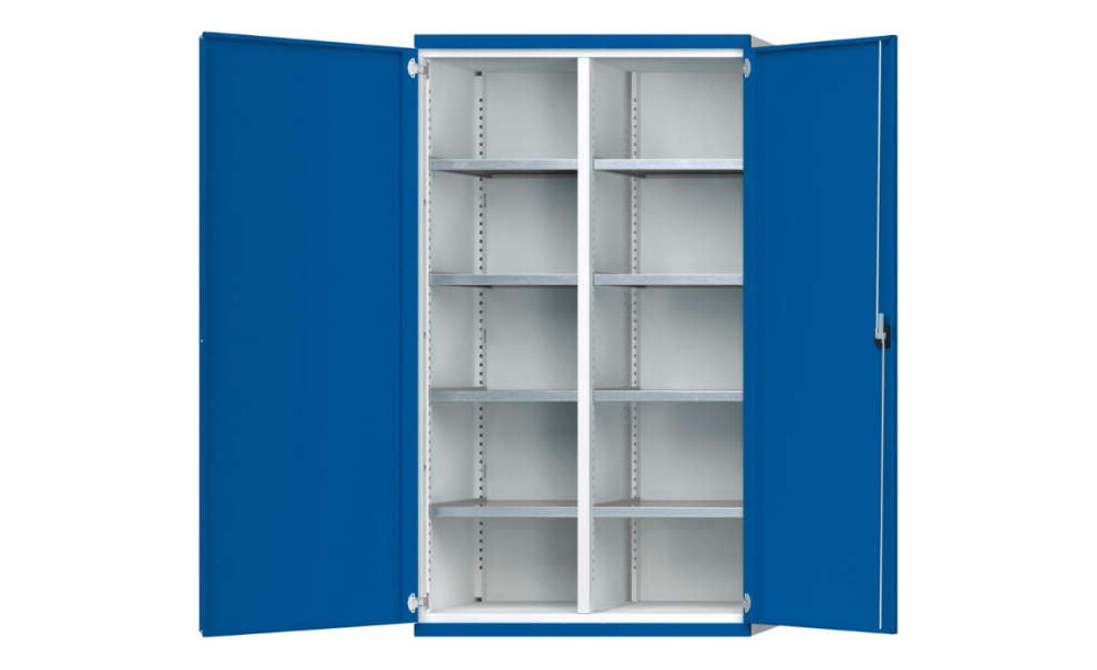 Schwerlastschrank ANKE, B1085xT400xH1950mm RAL7035/5010 m.Mittelwand8 Böden