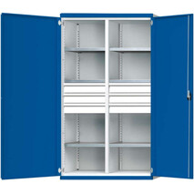 Schwerlastschrank ANKE, B1085xT630xH1950mm RAL7035/5010 m.Mittelwand6Böden,6Schubladen 100kg