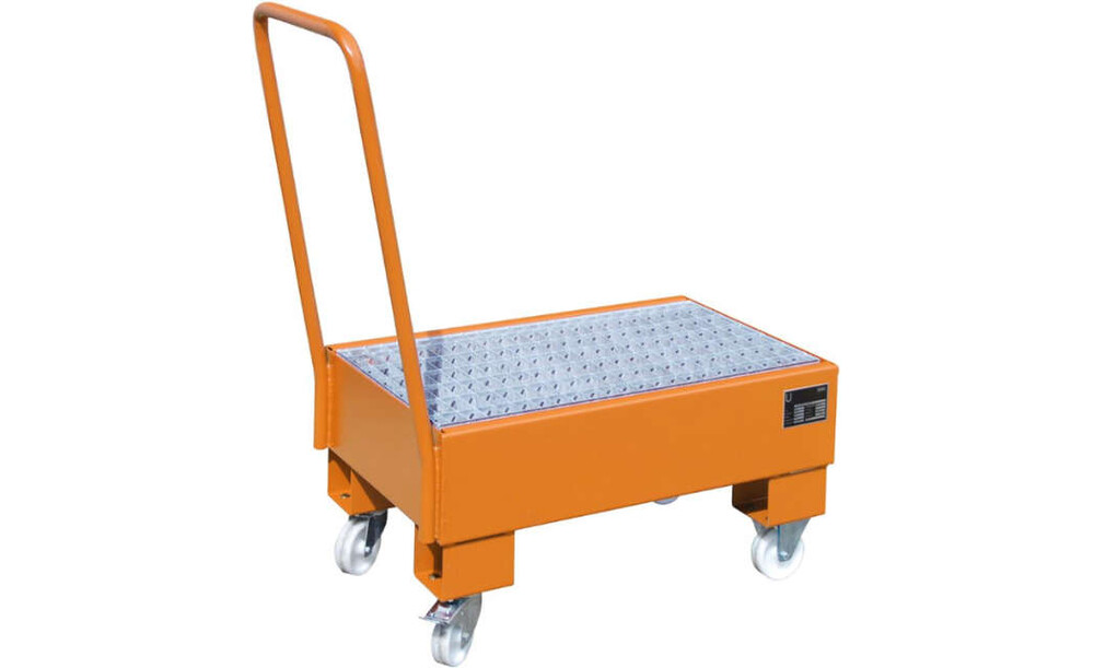 -Auffangwanne, fahrbar Diese Auffangwannen aus 3 mm Stahlblech und verzinktem Gitterrost haben eine Tragfähigkeit von 1000 kg/m². Das Fahrgestellt ist sehr stabil. Es verfügt über 2 Lenk- und 2 Bockrollen aus Polyamid, Ø 100 mm.
