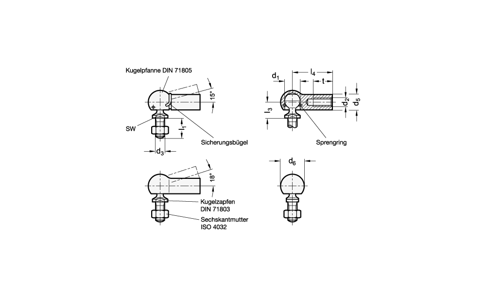 Winkelgelenke DIN 71802 bestehen aus Kugelpfannen DIN 71805 und Kugelzapfen DIN 71803.