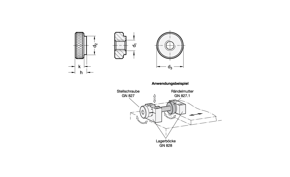 Rändelmuttern GN 827.1 werden in Verbindung mit Stellschrauben GN 827 eingesetzt, um damit Einstellungen und Positionen per Konterung zu sichern.