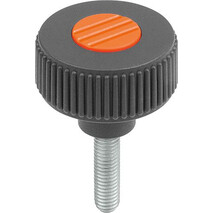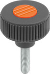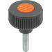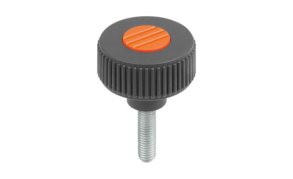 RÄNDELRAD GR.3, D1=63 D=M10X60, , FORM:L, THERMOPLAST SCHWARZGRAU RAL7021, KOMP:EDELSTAHL, DECKEL:ORANGE