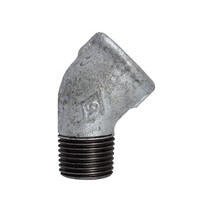 Winkel 121, 45°, IG/AG, Rp/R 2, Betriebstemperatur -20 °C bis 300 °C, schwarzer Temperguss, feuerverzinkt, DIN EN 10242. Nach DIN EN 10242 (vormals 2950). Die klassische und am weitesten verbreitete Verschraubungsserie im Rohrleitungsbau. Unsere Tempergussfittings zeichnen sich durch eine hohe mechanische Beanspruchbarkeit und durch eine Oberflächengüte nach DIN 2444 aus. Sie sind vollkommen mit einer Reinzinkschicht überzogen und somit trinkwassergeeignet sowie gegen Rost geschützt. Diese Tempergussfittings finden Verwendung im Maschinenbau, Außenleitungen, Kaltwasserleitungen und in Heizungsleitungen. Maximaler Einsatzbereich bei Minustemperaturen = -20 °C, 25 bar. Zulässiger Betriebsdruck bei Temperaturen zwischen -20 °C und 120 °C: 25 bar. Zulässiger Betriebsdruck bei Temperaturen zwischen 120 °C und 300 °C: 20-25 bar.
