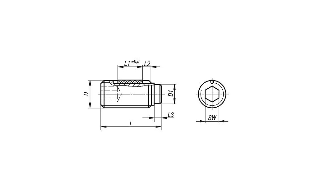 DRUCKSCHRAUBE OHNE KOPF, MIT GEWINDESICHERUNG M05X9, SW=2,5, STAHL 10.9 BRÜNIERT, KOMP:POM