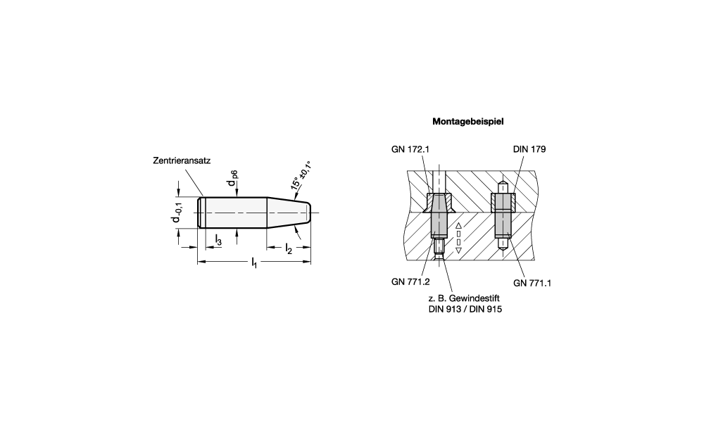 Positionierstifte GN 771.2 werden in Verbindung mit Positionierbuchsen GN 172.1 / GN 179.1 eingesetzt. Die Wellentoleranz p6 gewährleistet in einer Aufnahmebohrung H7 eine einwandfreie Presspassung. Der Zentrieransatz l3 erleichtert die Montage.