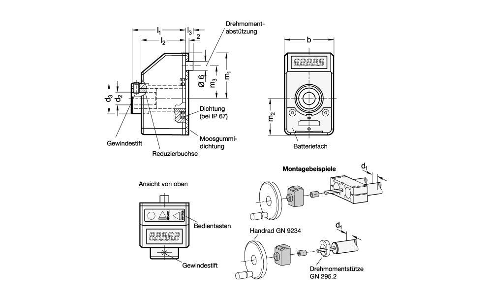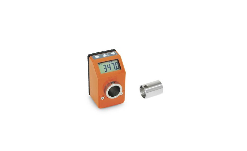 Elektronische Stellungsanzeiger GN 9034 sind für den Anbau an konfigurierbaren Lineareinheiten vorgesehen. Sie werden mithilfe einer Reduzierbuchse und einem Gewindestift auf den Spindelzapfen der Lineareinheit montiert. Die Stellungsanzeiger müssen über die Bedientasten auf die Gewindesteigung und -richtung der jeweiligen Lineareinheiten eingestellt werden. Die Energieversorgung wird durch eine Longlife-Batterie sichergestellt. Das Gehäuse ist mit Ultraschall verschweißt und dadurch besonders stabil, dicht und kompakt. Die Moosgummidichtung verhindert die Übertragung von Vibrationen und dient zur Abdichtung.