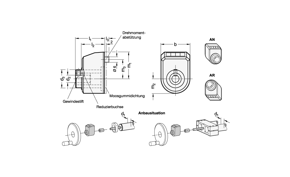 Stellungsanzeiger GN 9534 sind für den Anbau an konfigurierbaren Lineareinheiten vorgesehen. Sie werden mithilfe einer Reduzierbuchse und einem Gewindestift auf den Spindelzapfen der Lineareinheit montiert. Das direkt angetriebene Zählwerk mit digitaler Positionsangabe ist auf die Steigung der Gewindespindel abgestimmt.