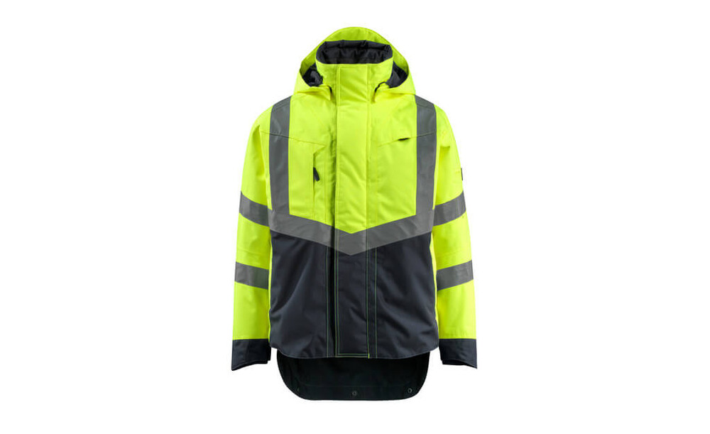 Fluoreszierend und mit Reflexschulterstreifen sowie schrägverlaufenden Reflexen. Zweifarbig. Atmungsaktiv, wind- und wasserdicht. Nähte sind verklebt. Futter aus Netzmaterial. Kapuze, abnehmbar, gefüttert und mit Elastikschnüren regulierbar, so dass diese über einen Helm passt. Regulierbarer Draht an beiden Seiten der Kapuze. Netzventilation mit Reißverschluss unter den Ärmeln. Stehkragen. Innenkragen aus Strick. Wasserdichte Stifttasche am Ärmel. Verschluss mit Reißverschluss und Wetterschutzleiste mit Druckknöpfen. Reißverschlussinnentaschen unter der Wetterschutzleiste – die eine speziell für Handys entwickelt, mit Öffnung sowie Schlaufen für das Kopfhörerkabel. Tasche mit Reißverschluss unter der Wetterschutzleiste, mit Platz für ein 7 Zoll Tablet. Verlängerter Rücken durch herunter knöpfbaren Stoff zum besseren Schutz vor Wind und Wetter. Brusttasche mit Reißverschluss. D-Ring. Ergonomisch geschnittene Ärmel ermöglichen hohe Bewegungsfreiheit. Rippenbündchen an den Handgelenken schließen gut ab und halten die Kälte draußen. Manschettenmit Verstärkungen aus CORDURA®-Gewebe und Druckknopfverschluss. Vordertaschen mit Reißverschluss. Hi-Vis Gruppe A. Zertifiziert nach EN ISO 20471 - Kl. 3 und EN 343 - Kl. 3/3. Das Produkt ist zertifiziert, dass dieses mit einem Logo von 0,0400 m² versehen werdendarf. Dieses zulässige Areal darf nicht überschritten werden. Das Logo auf der Vorder- und Rückseite darf jeweils maximal 50% des gesamten Logoareals betragen, um die Zertifizierung gemäß EN ISO 20471 beizubehalten.