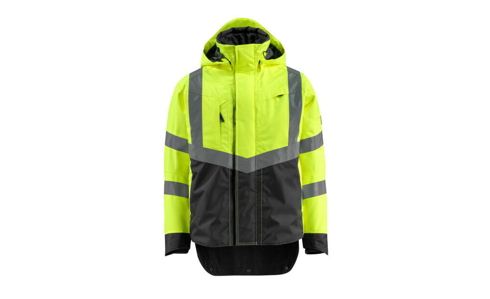 Fluoreszierend und mit Reflexschulterstreifen sowie schrägverlaufenden Reflexen. Zweifarbig. Atmungsaktiv, wind- und wasserdicht. Nähte sind verklebt. Futter aus Netzmaterial. Kapuze, abnehmbar, gefüttert und mit Elastikschnüren regulierbar, so dass diese über einen Helm passt. Regulierbarer Draht an beiden Seiten der Kapuze. Netzventilation mit Reißverschluss unter den Ärmeln. Stehkragen. Innenkragen aus Strick. Wasserdichte Stifttasche am Ärmel. Verschluss mit Reißverschluss und Wetterschutzleiste mit Druckknöpfen. Reißverschlussinnentaschen unter der Wetterschutzleiste – die eine speziell für Handys entwickelt, mit Öffnung sowie Schlaufen für das Kopfhörerkabel. Tasche mit Reißverschluss unter der Wetterschutzleiste, mit Platz für ein 7 Zoll Tablet. Verlängerter Rücken durch herunter knöpfbaren Stoff zum besseren Schutz vor Wind und Wetter. Brusttasche mit Reißverschluss. D-Ring. Ergonomisch geschnittene Ärmel ermöglichen hohe Bewegungsfreiheit. Rippenbündchen an den Handgelenken schließen gut ab und halten die Kälte draußen. Manschettenmit Verstärkungen aus CORDURA®-Gewebe und Druckknopfverschluss. Vordertaschen mit Reißverschluss. Hi-Vis Gruppe A. Zertifiziert nach EN ISO 20471 - Kl. 3 und EN 343 - Kl. 3/3. Das Produkt ist zertifiziert, dass dieses mit einem Logo von 0,0400 m² versehen werdendarf. Dieses zulässige Areal darf nicht überschritten werden. Das Logo auf der Vorder- und Rückseite darf jeweils maximal 50% des gesamten Logoareals betragen, um die Zertifizierung gemäß EN ISO 20471 beizubehalten.